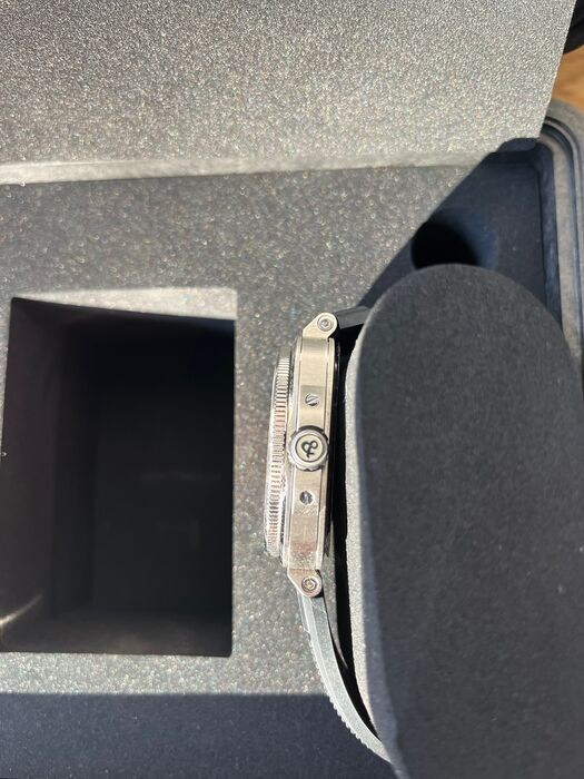 Breedte 42 mm. Gepolijst satijnstaal. Unidirectioneel roterende bezel gegradueerd 60 minuten in staal met zwart geanodiseerd aluminium inzetstuk