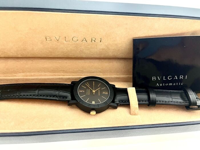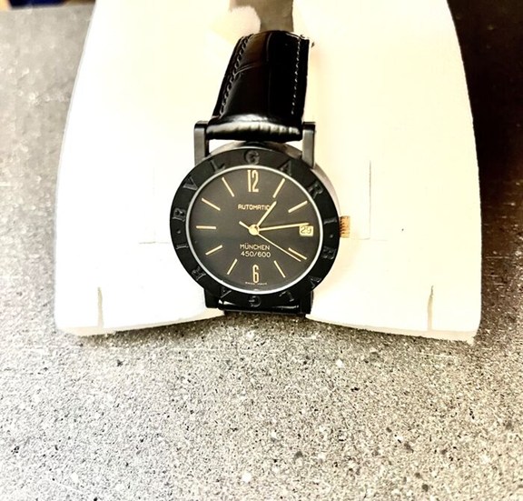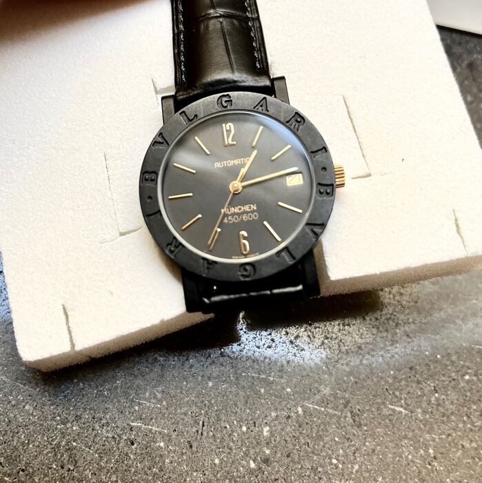 Kast/armband: staal, zwart zwart leren band met doorngesp, zwart gelakt, wijzers/indexen goudkleurig.