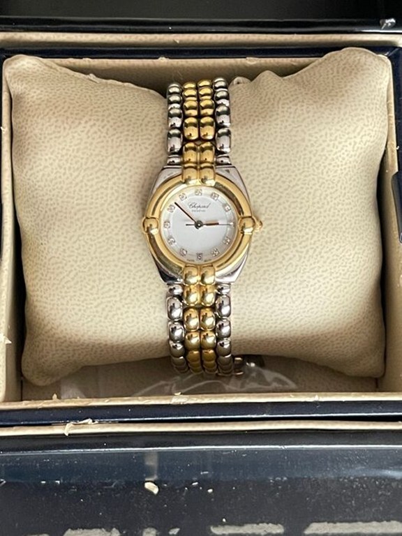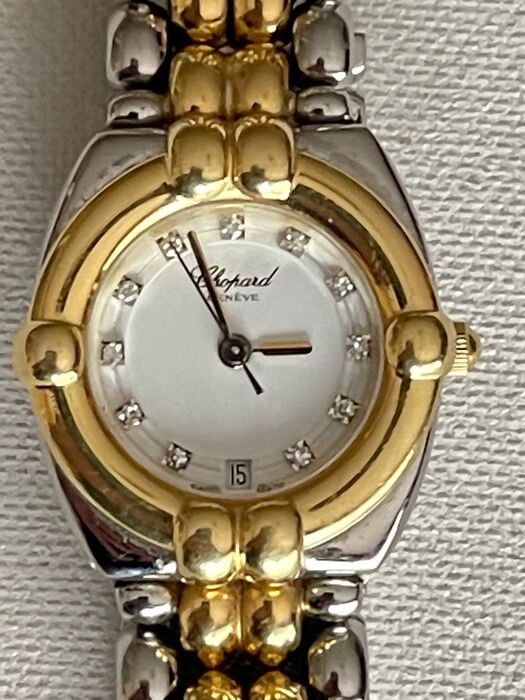 Gegarandeerd origineel horloge (nov 1991) van "Lady" in goud en staal van Zwitserse origine, merk "CHOPARD Genève" gecertificeerd met certificaat aanwezig bij aankoop. De binnenkant van het horloge is gecertificeerd met 11 mini briljanten op de uren en een tijdstempel op nummer 6, werkt op een Quartz batterij, is in nov 2017 volledig gereviseerd (met horlogemakerscertificaat) en verkeert in zeer goede staat. Het complete pakket wordt geleverd met 2 verlengstukken van de armband.