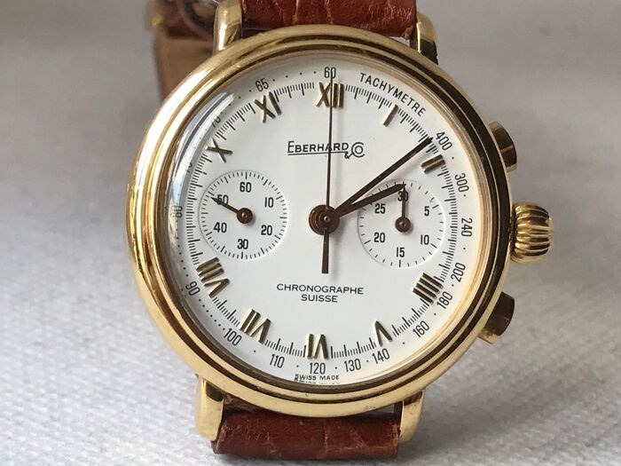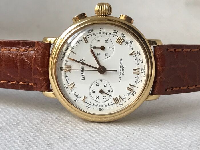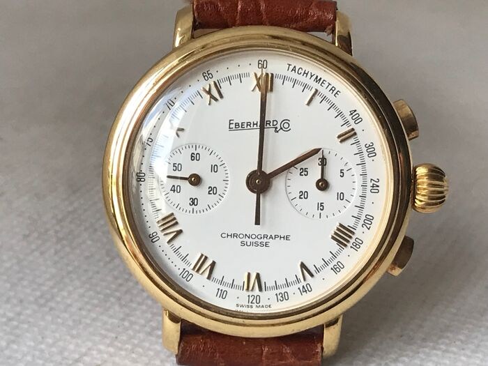 Prestigieuze Eberhard & Co. chronograaf met handopwinding in 18K geel goud, Met beroemde Lemania 1872 chronograaf uurwerk, In werkende staat, Mooie wijzerplaat met opgelegde Romeinse cijfers, Nieuwe generieke band met Eberhard gesp, lengte 21 cm, Totaal gewicht 50 gram, Diameter mm. 33 exclusief kroon, met generiek reisetui, aangetekende en verzekerde verzending.
