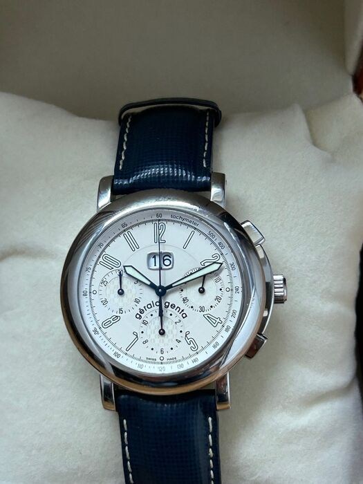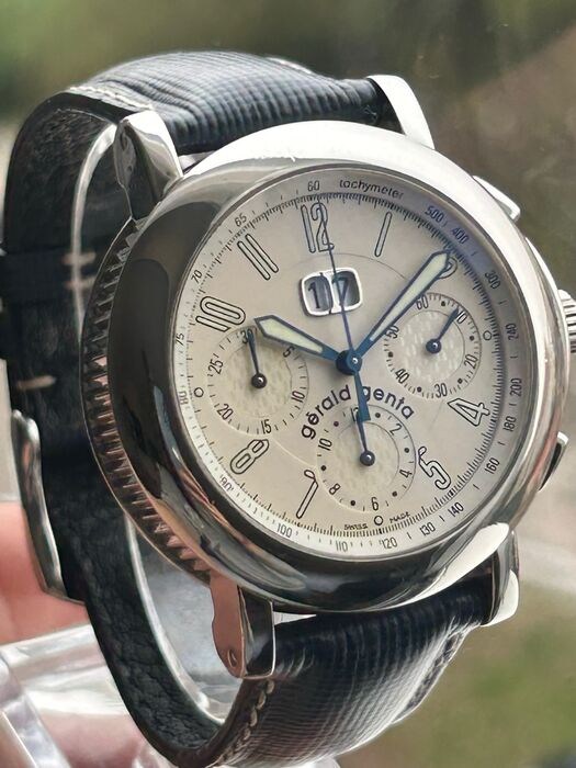 Dit horloge stamt uit het ateliertijdperk en heeft een geweldige witgelakte wijzerplaat met guilloché aangebrachte indexen, chronograaffunctie,