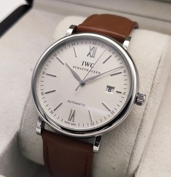 IWC staat bekend om zijn vermogen om prachtige vintage horloges te maken. Deze heeft een set bruine leren banden. Het maakt deel uit van hun Portofino-lijn en heeft een strategisch gewogen kast van roestvrij staal. De gladde koepelvormige bezel herbergt een zilverkleurige wijzerplaat met indexuurmarkeringen.
