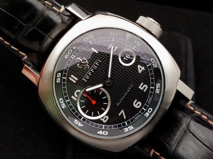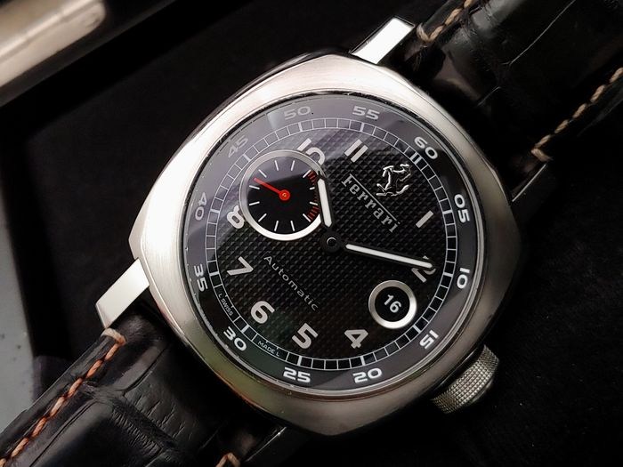 Panerai horloge, model: Ferrari Gran Turismo, referentie: F6654, gemaakt in een beperkte oplage, in goede staat zoals te zien op de foto's, compleet met originele doos en certificaat van de Zwitserse officiƫle chronometercontrole, geen garantiedocumenten.