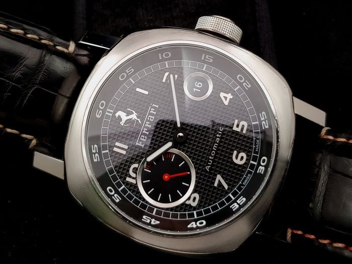Wijzerplaat met zwarte rasterafwerking, Ferrari "Cavallino Rampante"-logo op 12 uur, zwarte wijzers met wit oplichtend, Arabische cijfermarkeringen, secondenteller op 9 uur, ring met minutenschaal aan de binnenkant.