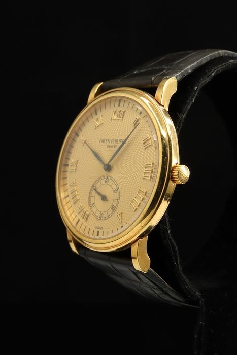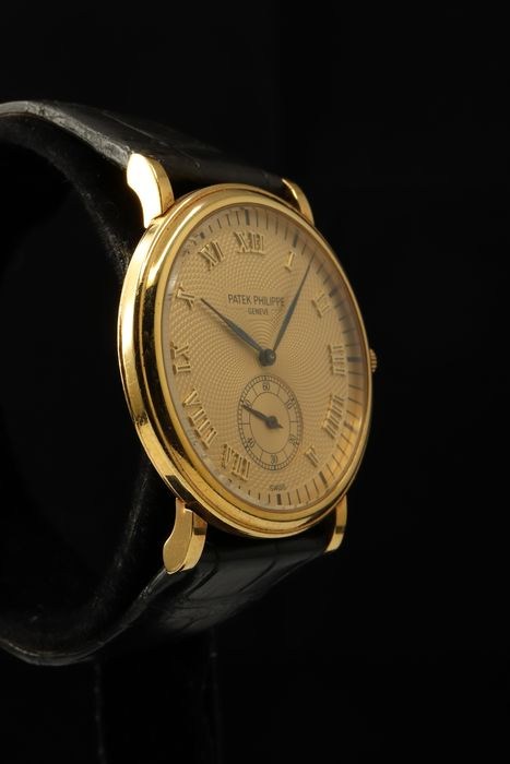 Patek Philippe Calatrava 5022J handopwindbaar horloge, heeft een 34 mm 18k geelgouden kast rond een gouden Guilloche wijzerplaat bezet met Romeinse cijferuurmarkeringen op een zwarte alligatorband met een 18k geelgouden tanggesp. Functies omvatten uren, minuten en kleine seconden.