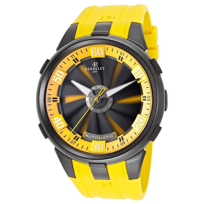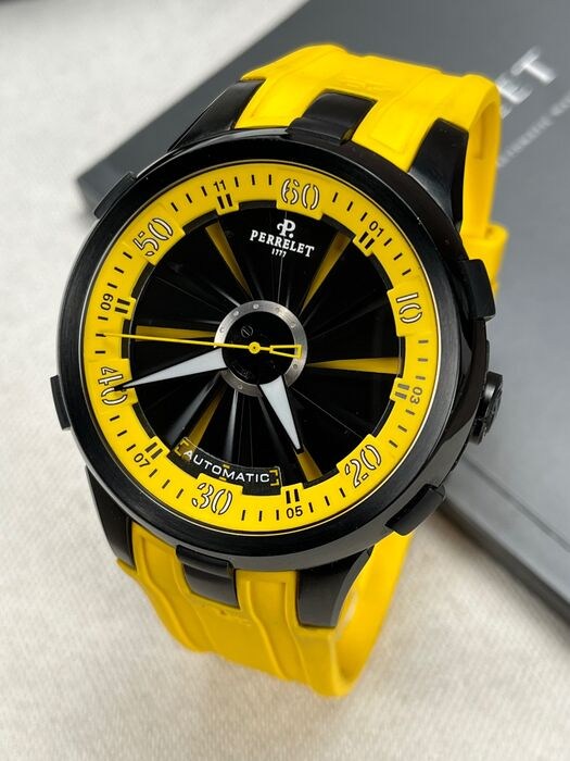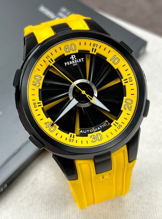 Een prachtig herenhorloge van Perrelet, uit de Turbine serie. Referentienummer A1051/7. De wijzerplaat is voorzien van een vrij draaiende turbinerotor. De Turbine-rotor heeft 12 zwartgeblakerde bladen boven een zwart-geel gestreepte wijzerplaat op de achtergrond. De vrij draaiende turbinerotor zorgt voor een opvallend optisch effect wanneer het horloge geschud wordt. Het geheel is extra opvallend door de gele accenten en comfortabele rubberen gele band. Het horloge heeft enkele gebruikssporen.