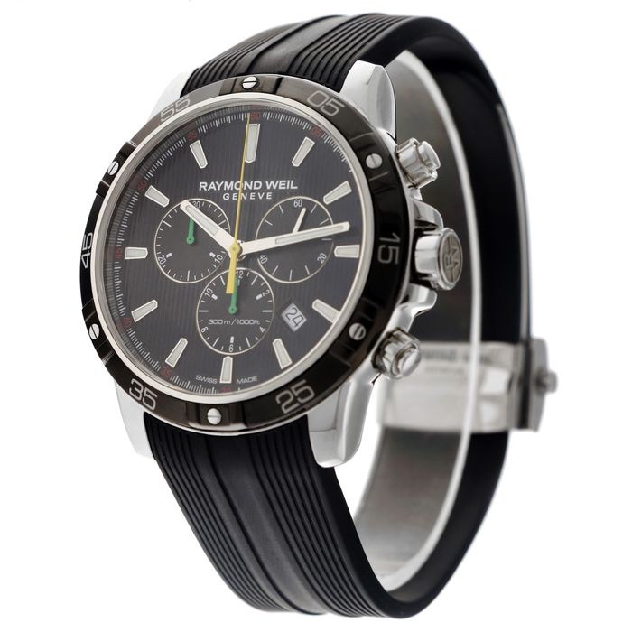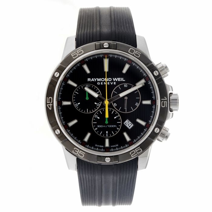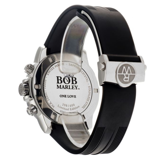 Een speciale Bob Marley uitgave van een Raymond Weil Tango herenhorloge uit 2018. Limited Edition nummer 398 van slechts 600 gemaakte horloges. Reggae accenten op de wijzerplaat, rode markers, groene subdial wijzers en een gele chronograaf secondewijzer. Geschroefde kroon en pushers en een positieve waterdichtheid test van -0.3 en + 3 bar op 27-9-2022. Certificaat van echtheid aanwezig.