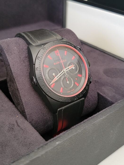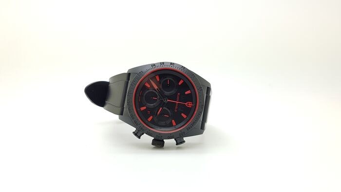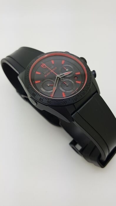 42 mm geparelstraalde kast van mat zwart keramiek, geschroefde kroon van zwart pvd-behandeld staal, gegraveerd met Tudor-logochronograafdrukknoppen in zwart pvd-behandeld staal op 2 uur en 4 uur snelle datumcorrector, matzwarte pvd-behandelde staal op 9 uur, waarvoor het tudor-gereedschap nodig is, vaste matzwarte keramische lunette met gegraveerde tachymetrische schaal, saffierglas, zwarte wijzerplaat met rode index, 30-minutenteller op 3 uur en 12-uursteller op 6 uur, kleine secondewijzer op 9 uur, datum op 4.30 uur, kaliber 7753 zelfopwindend uurwerk, ongeveer 46 uur gangreserve, zwarte rubberen band, vouwgesp en veiligheidspal. Waterbestendig tot 150 m (500 ft).