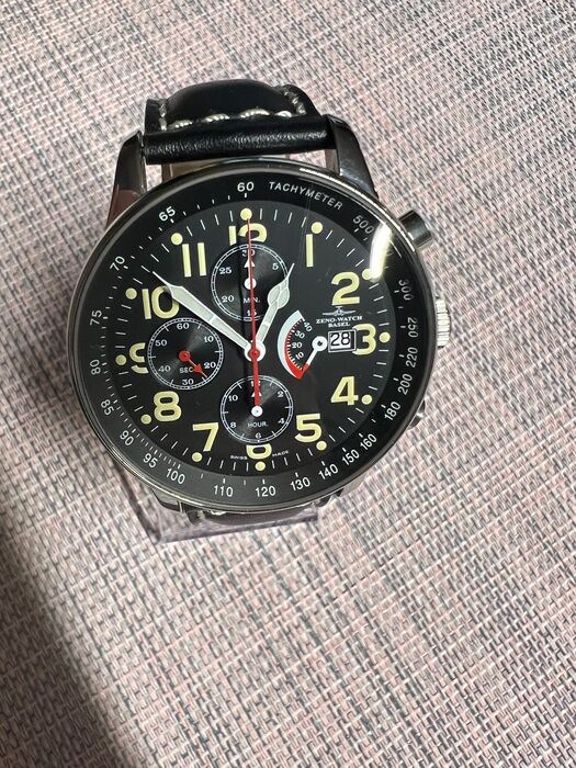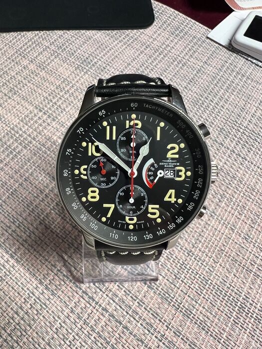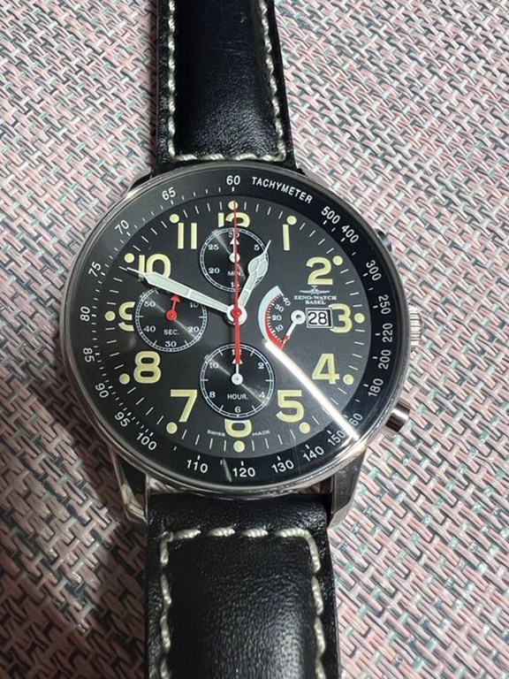 Het Zeno horloge retro chronograaf met minutenteller op 12 uur, urenteller op 6 uur, stop-seconden in het midden, kleine seconde op 9 uur, gangreserve/datum op 3 uur, tachymeterschaal