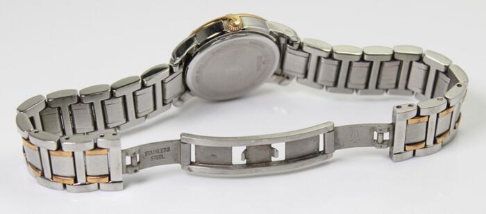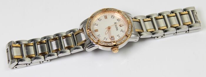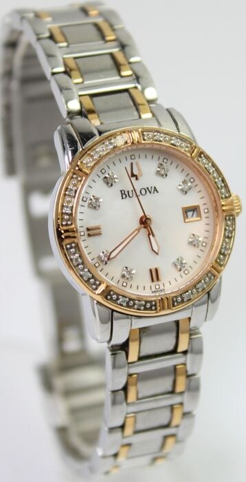 Dit is een prachtig luxe Bulova diamanten horloge dat in uitstekende staat verkeert. Het beschikt over met de hand gezette diamanten in de wijzerplaat. Prachtige rosévergulde kast en Bulova Two Tone band
