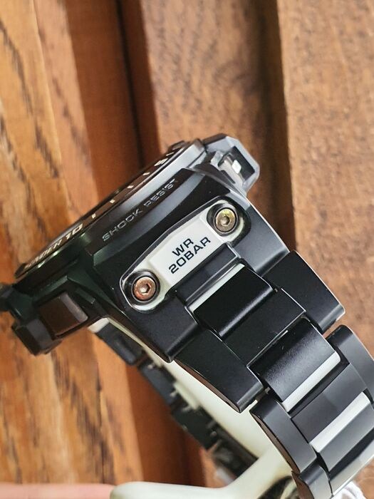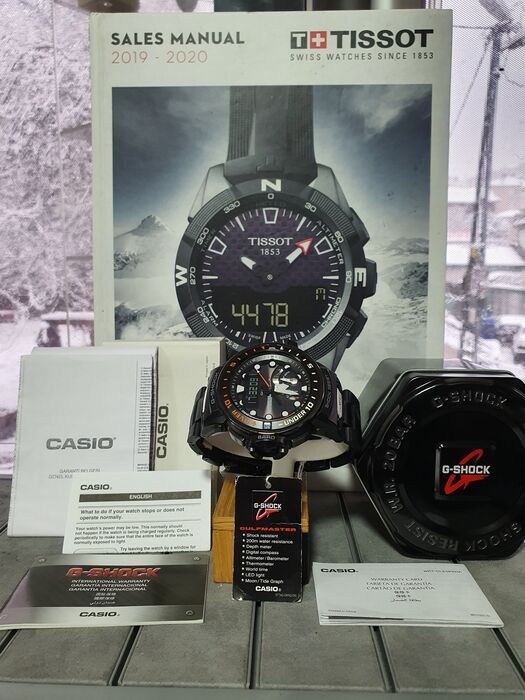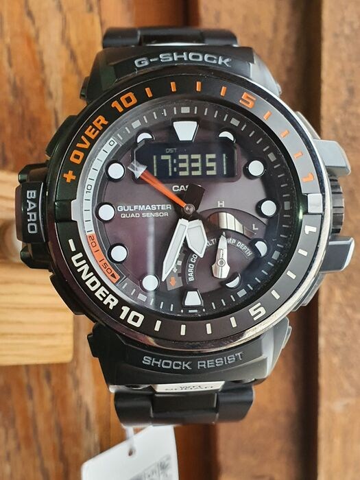 GULFMASTER bevat de eerste G-SHOCK-modellen die zowel Triple Sensor versie 3 als Smart Access in hetzelfde horloge integreren. Naast barometrische druk-, hoogte-, peiling- en temperatuurmetingen, beschikken deze nieuwe modellen ook over getijdengrafieken en maantijdperken om u te helpen nauw contact te houden met uw natuurlijke omgeving. Plotselinge extreme veranderingen in luchtdruk worden gealarmeerd met behulp van een wijzerplaat, een LCD-scherm en een alarm. Dubbele LED-verlichting verlicht het LCD-scherm en voegt ook een gezichtsverlichting toe om 6 uur om informatie helder en gemakkelijk leesbaar te houden, zelfs in totale duisternis.