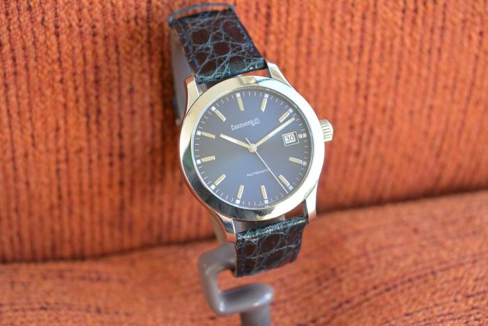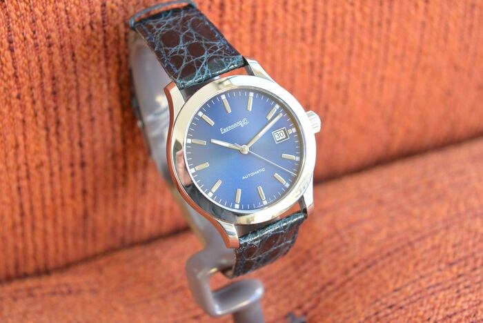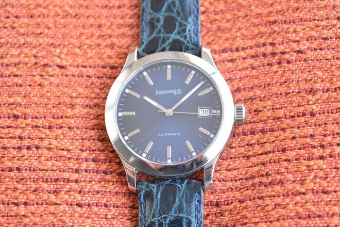 Te koop, Eberhard Aiglon horloge ref.41116, stalen kast diameter 37 mm, blauwe wijzerplaat met stalen cijfers op staven met tritium, stalen bollen met tritium, datumweergave op 3 uur, met ontvoerde klik van de datum, merkschroef kroon, volledig stalen achterkant van de kast gemerkt vast met 4 schroeven, zelfopwindend uurwerk op een ETA 2824-2 basis afgewerkt en aangepast door Eberhard, generieke blauwe echte krokodillenband, lengte 24 cm