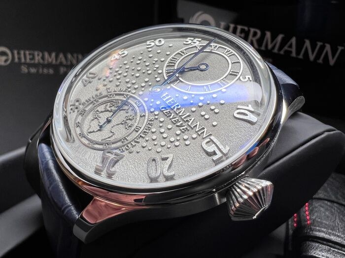 Het model CELESTIAL is een exclusief en zeldzaam horloge met een gefabriceerd Regulator uurwerk in Zwitserland door HERMANN Genève.