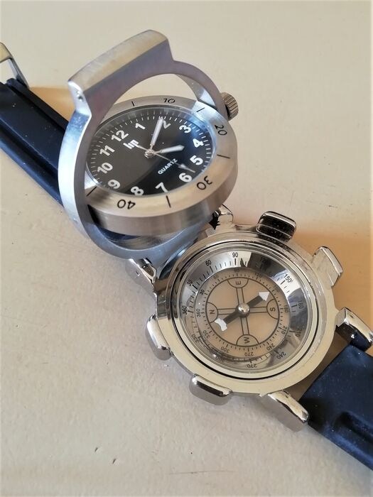 LIP CLASSICS horloge met kompas aan de onderkant, het horlogegedeelte is op een scharnier gemonteerd om het kompas te gebruiken zonder het horloge van de pols te halen.