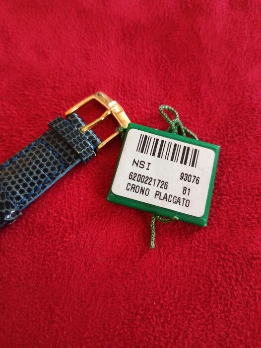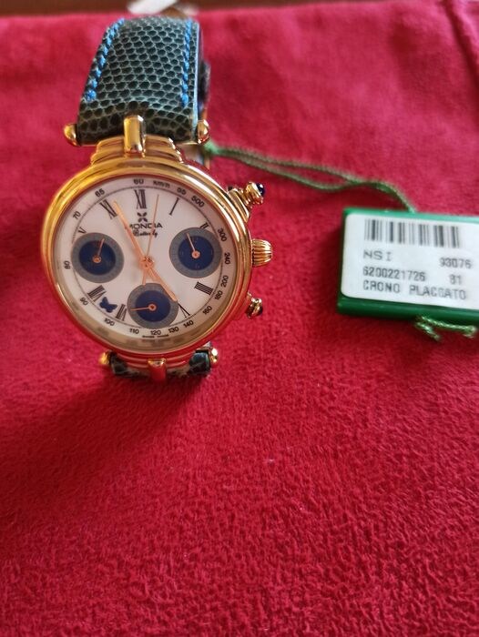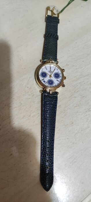 Mondia Vintage Watch Butterfly-collectie, analoge chronograaf met quartz uurwerk met datum. koffer diam. 32 mm, in geel verguld roestvrij staal. Witte wijzerplaat Gouden wijzers. Vintage blauwe leren band Nieuw ongedragen band met onvolkomenheden door de tijd.