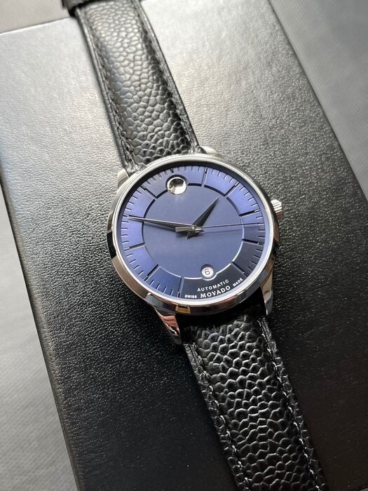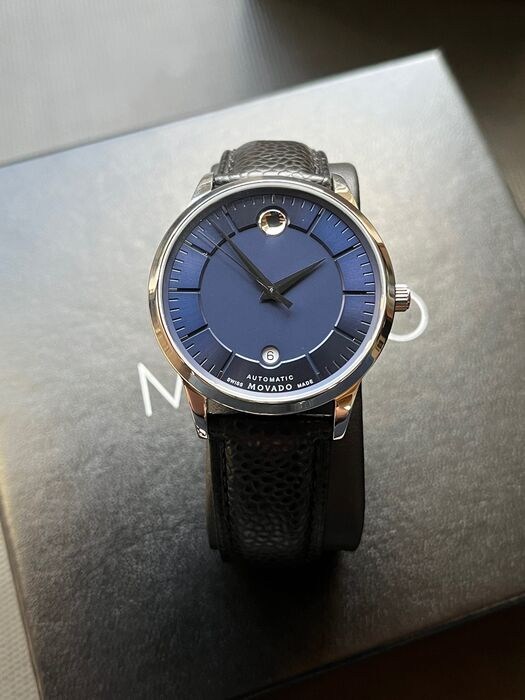 Te koop is dit nieuwe en ongedragen automatische (Zwitsers uurwerk) Movado horloge. Het heeft een roestvrijstalen kast van 39,5 mm, met een blauwe wijzerplaat (met gestempelde uurmarkeringen) en krasbestendig saffierglas. De Movado heeft een datumvenster op de 6 uur positie. Een ander mooi kenmerk is de achterwand van de tentoonstellingskast.