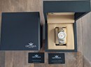 Functies: Centrale uren, minuten, stop seconden in het midden, 30 minuten teller op 9 uur, Kleine seconde op 3 uur, Maanfase op 6 uur. Datum om 4 uur.