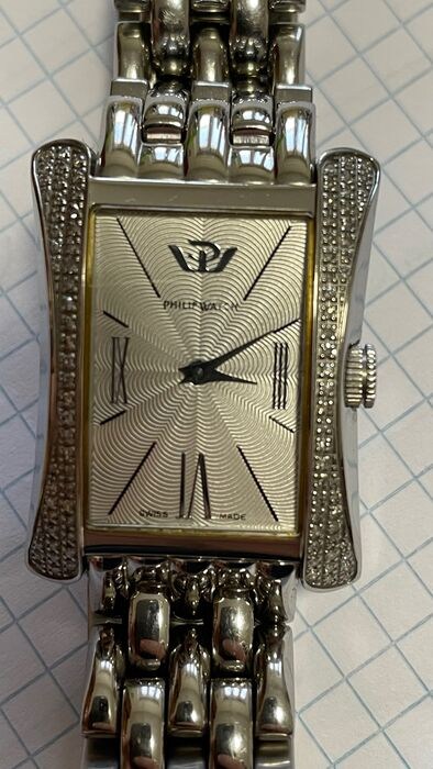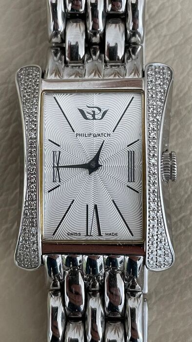 Occasion te koop voor de halve prijs Philip Watch quartz dameshorloge uit de Panama Diamonds collectie Rechthoekig stalen quartz uurwerk met gepolijste afwerking en gezette diamanten.
