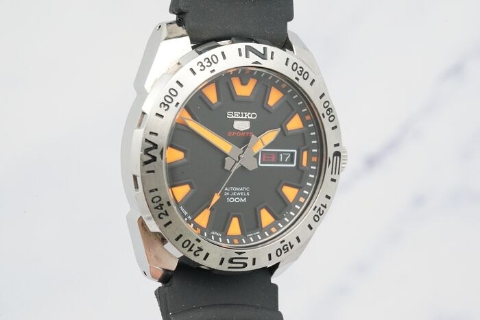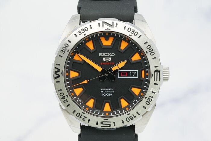 Model: Seiko 5 Sports SRP741J1 Pumpkin Black Heren 100m waterdicht kompas automatisch horloge