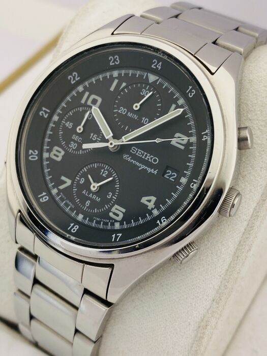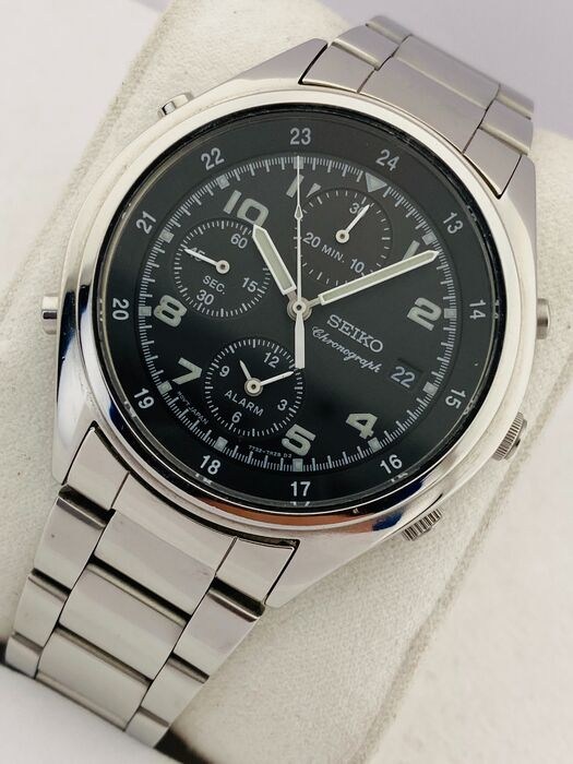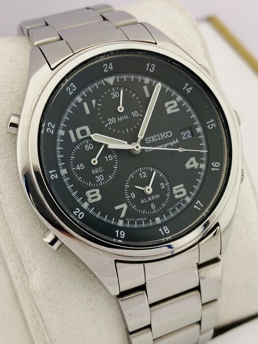 Goed bewaard gebleven Seiko met zwarte wijzerplaat en lichtgevende wijzers. Een schattig horloge met chronograaf-, alarm- en datumfuncties.