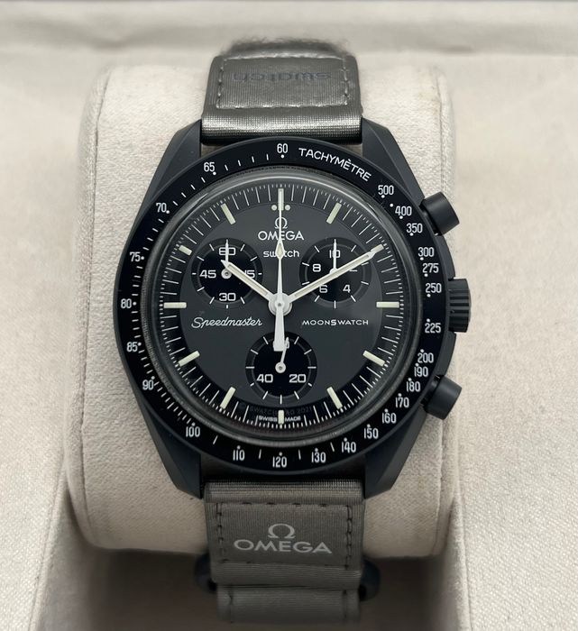 Met zijn intens diepgrijze kleur en metallic grijze VELCRO band, dit horloge betekent zaken. De chronograaf secondewijzer, subdial handen en tachymeter schaal zijn in het wit. De subdials en bezel achtergrond in zwart. Alle wijzerplaten dragen de OMEGA X SWATCH-branding, evenals het iconische Speedmaster-logo en het nieuwe MoonSwatch-logo. De glazen constructie, de "verborgen" S geïntegreerd in het midden van het kristal, het fijne en verfijnde cirkelpatroon op de buitenste ring van de wijzerplaat en de subdials, de scherpe en gladde nokkenconstructie, het iconische "dot over 90" detail op de tachymeter geschaalde bezel, en natuurlijk de unieke biokeramische touch zijn gemeenschappelijk voor alle modellen en staan voor een gepassioneerde liefde voor details. Alle uren, minuten, secondewijzers van de chronograaf en uurmarkeringen hebben een superluminova voor een perfecte glow in the dark.