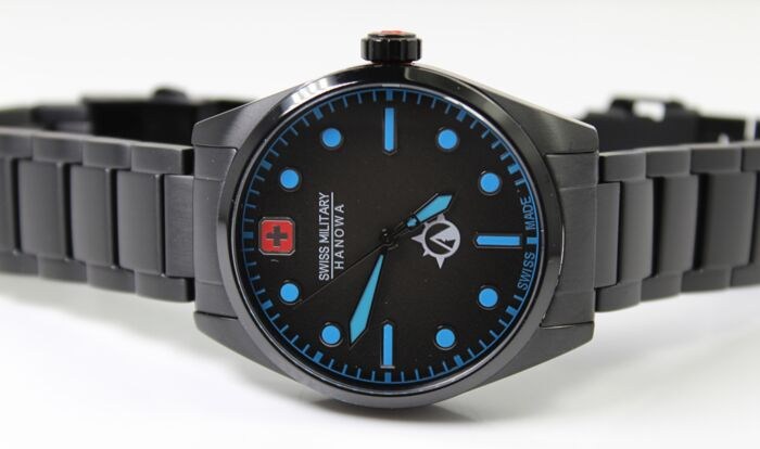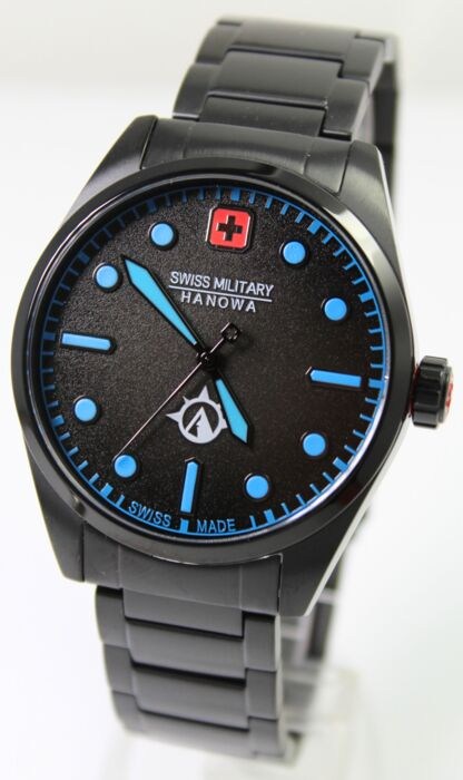 Dit Swiss Military Hanowa luxe Swiss Made horloge heeft een zwarte PVD roestvrijstalen armband, saffierglas, 100 WR en een opvallende wijzerplaat met blauwe markeringen en wijzers.