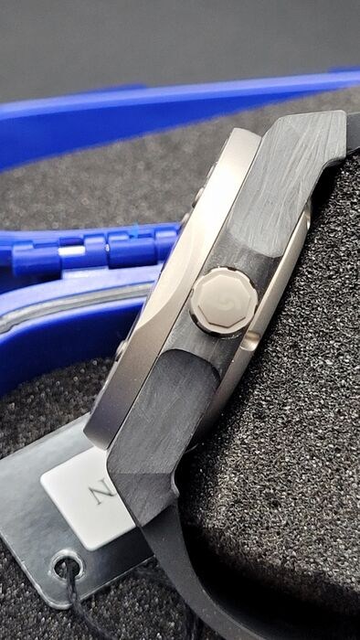 De kast van gesmeed carbon heeft een diameter van 47 mm (zonder kroon) en een dikte van 14,5 mm en weegt ongeveer 100 g. Gewicht.