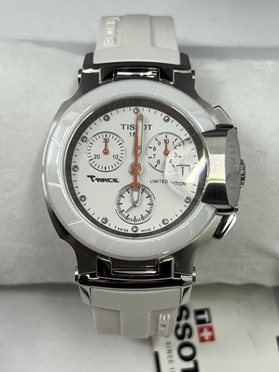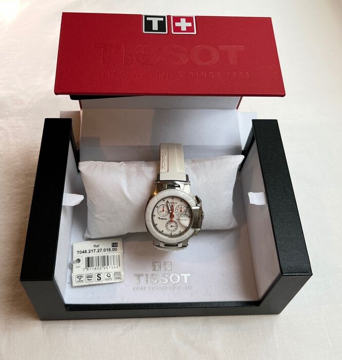 De Tissot T048.217.27.016.00 is een T-Race dameshorloge. Roestvrijstalen kast met een witte rubberen band en saffierkristallen. Witte wijzerplaat bezet met diamanten met oranje accenten. Quartz uurwerk op batterijen. Waterbestendig tot 100 meter / 330 voet. Ronde kastvorm. Kastmaat: 36,65 mm. Bandbreedte: 15 cm. Vouwsluiting met drukknopontgrendeling. Horlogelabel: Zwitserse makelij. T-Sport dameshorloge met witte wijzerplaat T048.217.27.016.00