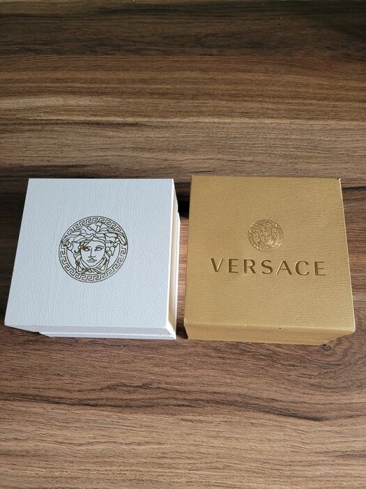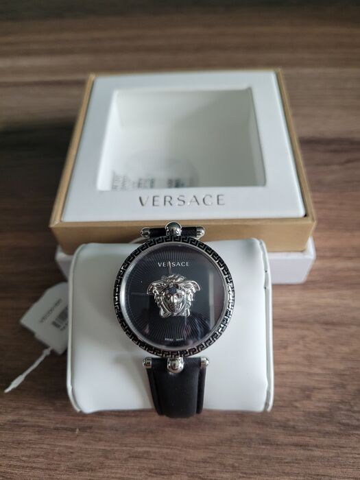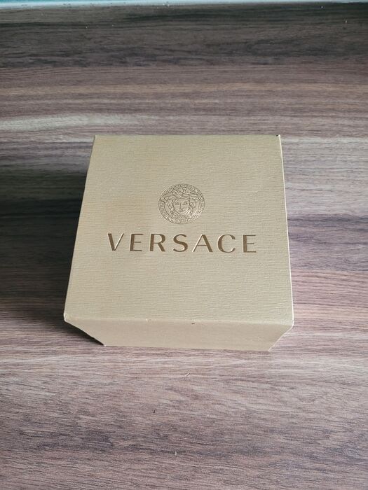 39 mm x 12 mm gepolijste 316L roestvrijstalen kast met Versace-vormige zwarte geëmailleerde bezel - Massieve 316L roestvrijstalen achterkant met Medusa-kopgravure - Antireflecterend saffierkristal - Drukknopkroon.