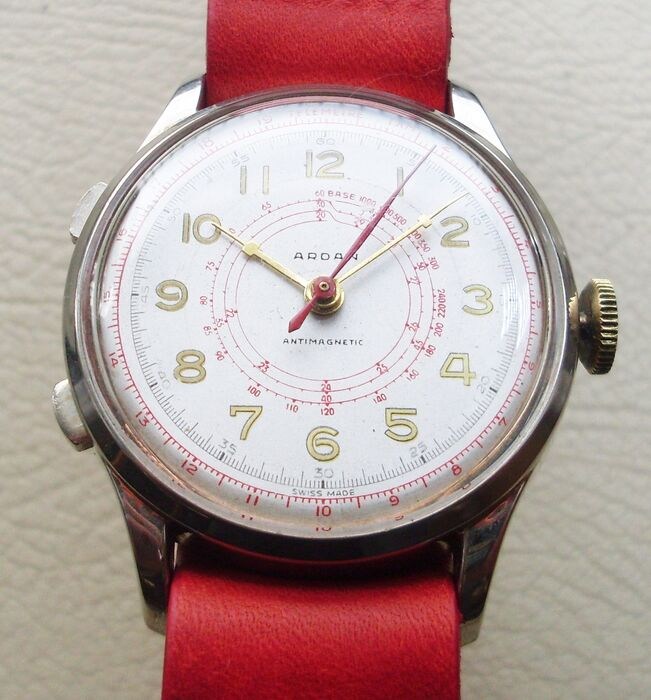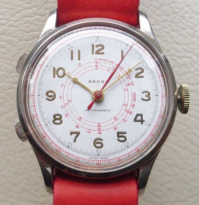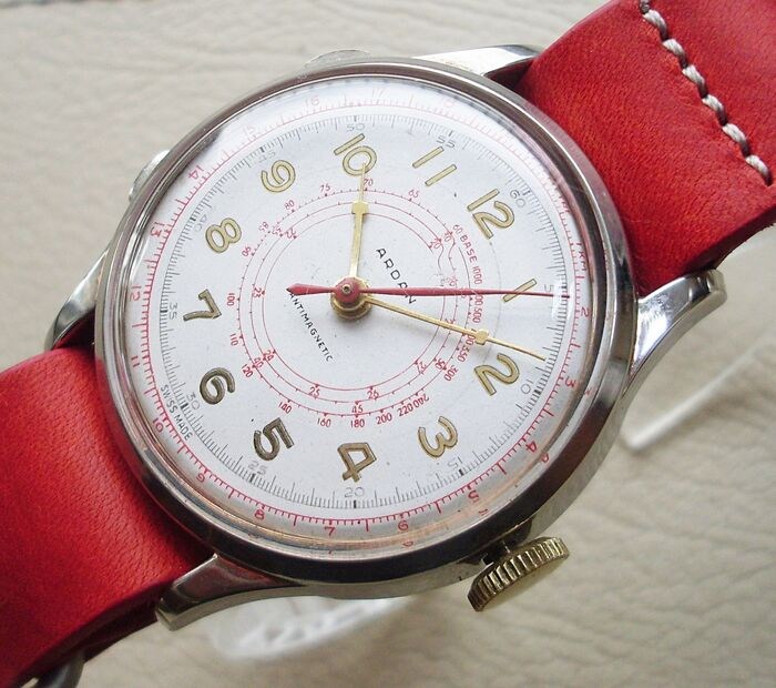 Handmatig opwindbaar uurwerk, dubbele knop en kroon: dit horloge werd gebruikt voor "spot" metingen, waarschijnlijk voor sportevenementen of om twee horloges te synchroniseren en de meting te starten.