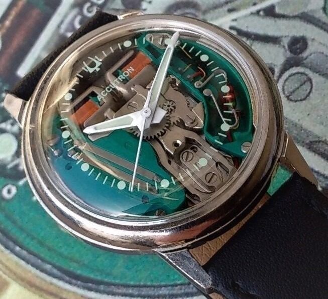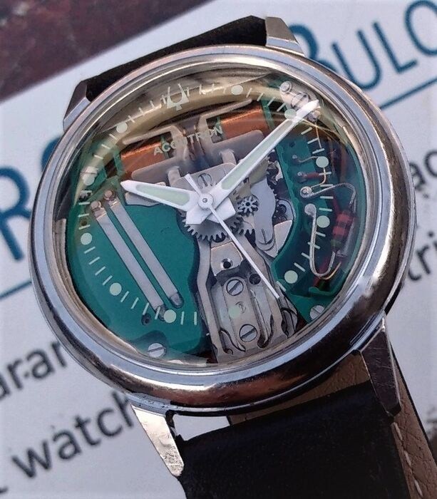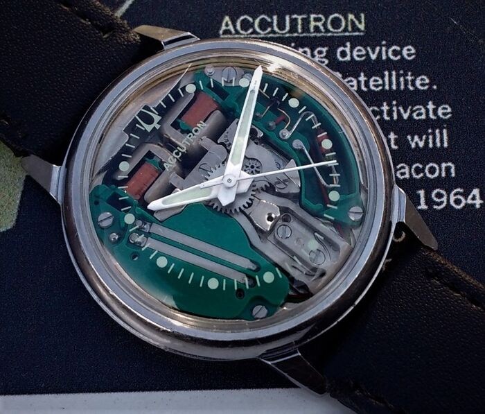 het koepelvormige kristal heeft Accutron-markeringen en -logo.