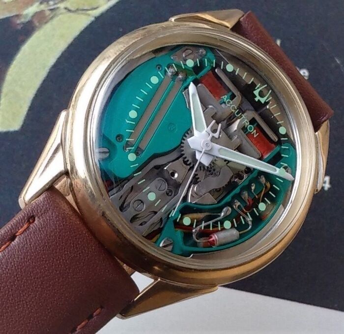 het koepelvormige kristal heeft Accutron-markeringen en -logo.