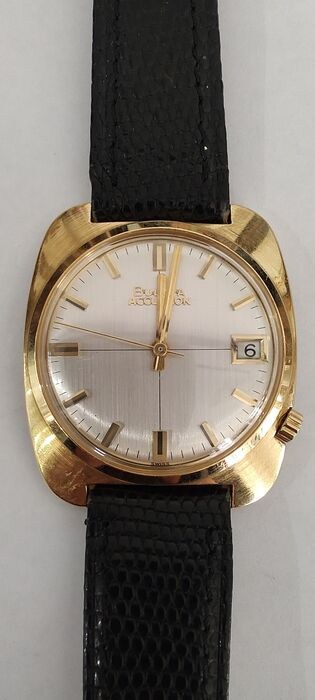 Bulova 18k gouden horloge. uitstekende staat. Wordt geleverd met nieuwe batterij geplaatst. Originele band vanaf het moment van aankoop. Kastmaat 35mm x 40mm. Totaalgewicht van horloge met band ca. 47 g Stemvork in perfect werkende staat maar registratie is vereist voor niet-originele batterijwissel uit die periode.