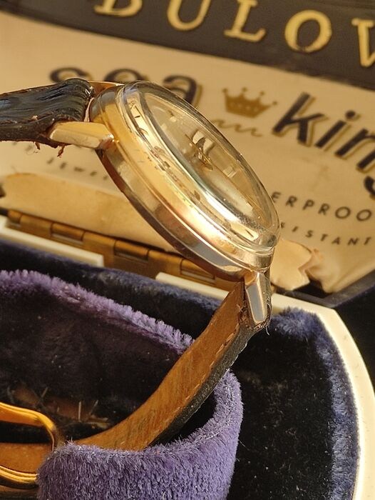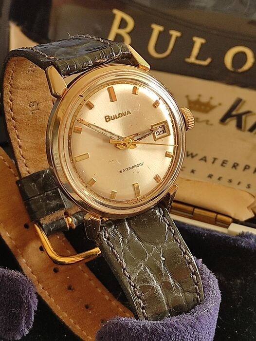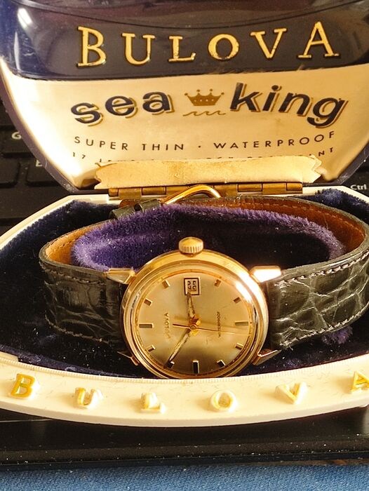 Bulova Zeekoning. Vergezeld van zijn originele doos, nieuw glas, datumweergave op 3 uur, goed werkende indexen en gangreserve, 33 mm kast zonder kroon.