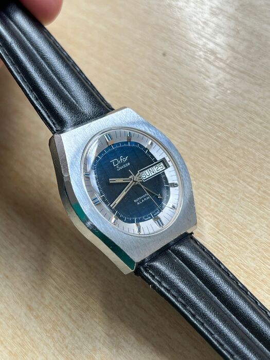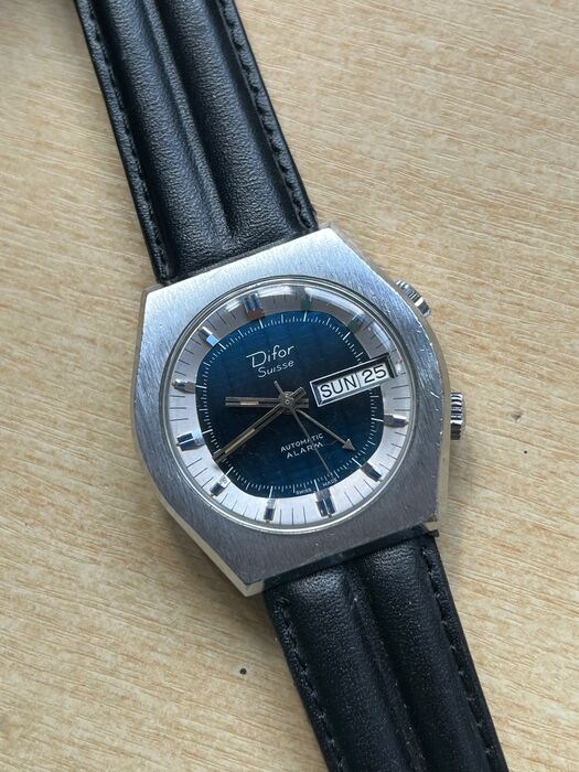 Schitterend Zwitsers difor alarm horloge in zeer goede staat. De ringtone en de beweging werken perfect. Prachtige blauwe wijzerplaat! 40x41mm kast exclusief kroon. Nieuwe lederen band