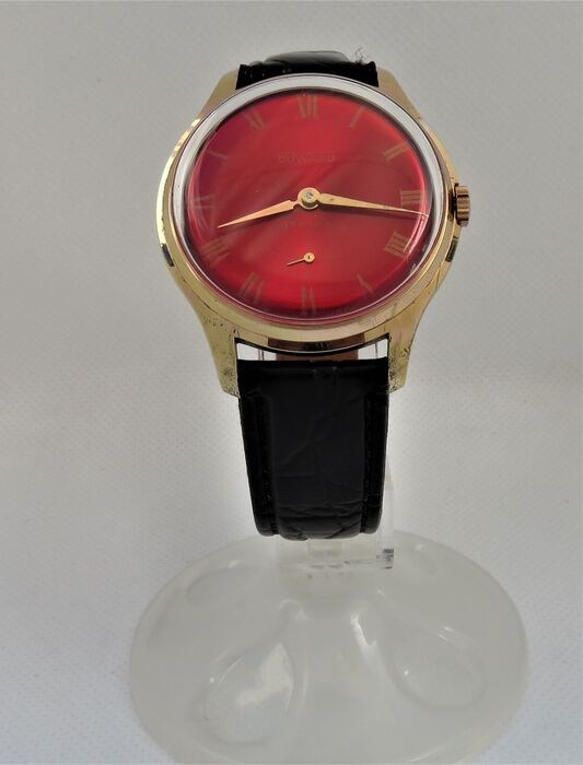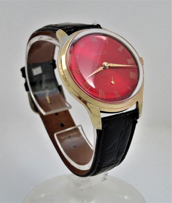 Klok gemaakt in de jaren 60, met een heerlijke rode wijzerplaat. Zwart leren armband (18 mm.). De diameter van de kast zonder de kroon mee te tellen is 37 mm. Het is net nagekeken door een professionele horlogemaker en werkt perfect. nieuwe plexi. Het wordt geleverd in een kartonnen doos die niet origineel is voor het horloge.