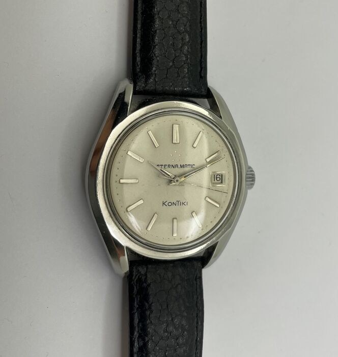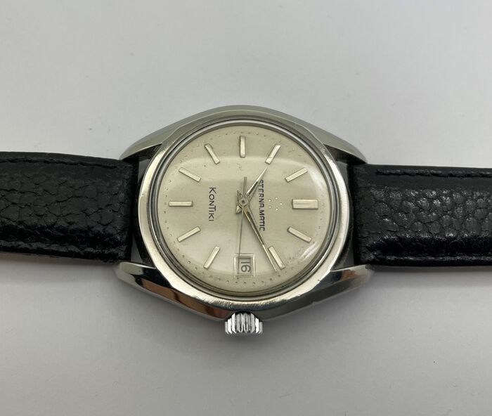 In goed werkende staat. Grote stalen kast met Kontiki logo in goud op de achterkant. Diameter 36 mm exclusief handvatten en kroon. Lengte met de handgrepen 44 mm. Eterna Matic uurwerk cal 1424 UD. De kast, de wijzerplaat en het uurwerk zijn Eterna gesigneerd. Nieuwe lederen band. Totale lengte 24cm.