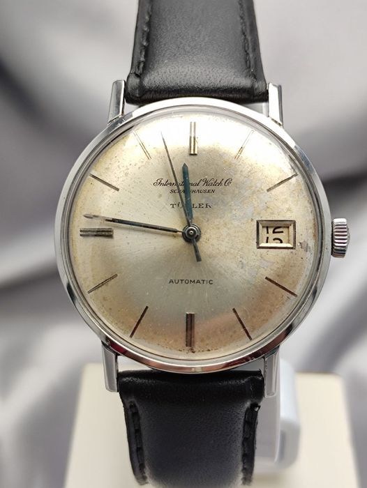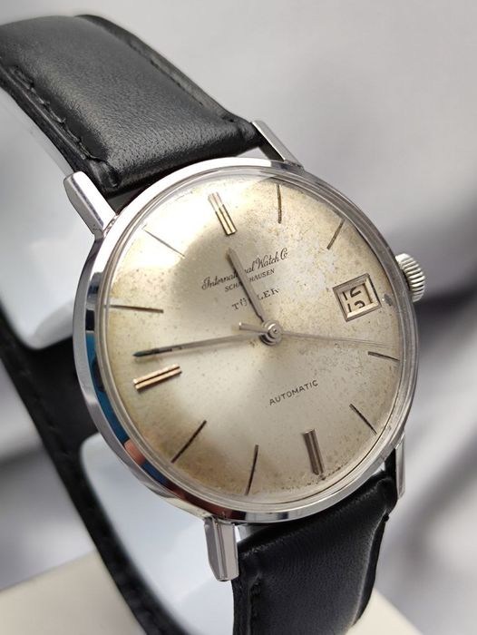 Hier is een prachtige, volledig originele IWC ref 807A uit 1962. De zilveren sunburst-wijzerplaat is in zeer goede staat, met een IWC-scriptlogo. Het heeft gefacetteerde stalen staafuurmarkeringen met puntige punten, dubbel op 12 uur. De uurmarkeringen vertonen wat corrosie op close-up foto's. De wijzers zijn in prima staat. De hack stopt de secondewijzer wanneer de kroon wordt uitgetrokken naar de tijdinstellingsmodus, om een nauwkeurigere tijdinstelling mogelijk te maken. Het stalen framevenster om 3 uur geeft de datum weer, die semi-snel kan worden ingesteld door eerst de wijzers tot middernacht te draaien zodat de datum verandert, dan onmiddellijk de wijzers achteruit te draaien naar 23:45 en dan weer vooruit tot middernacht. Herhaal indien nodig.