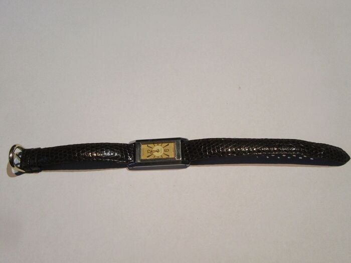 - Horloge met chocoladekleurige band. Hij is 3 cm lang, 1,2 cm breed en 5 mm dik.