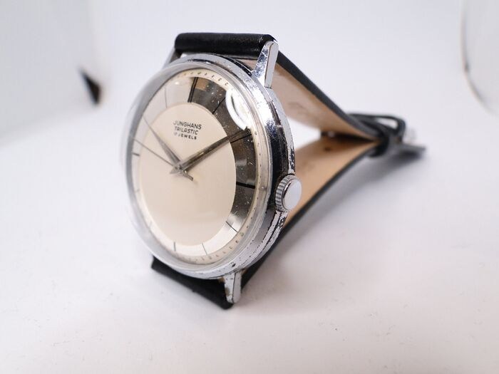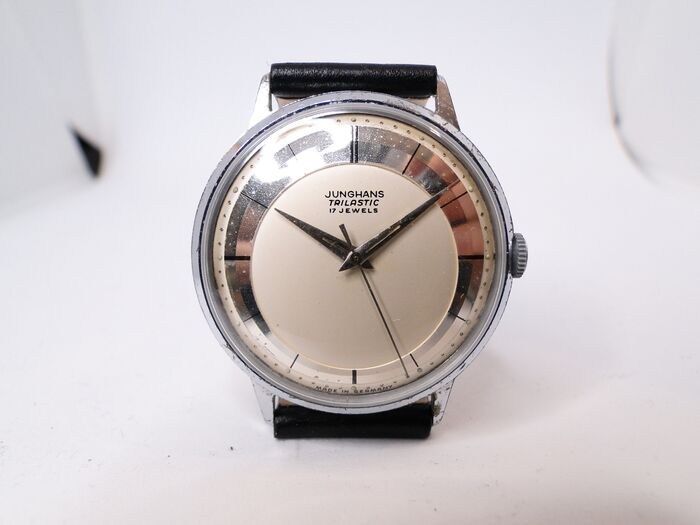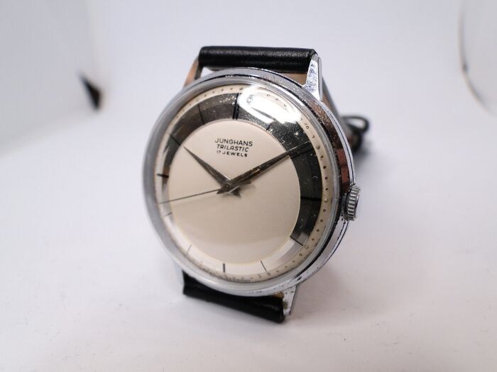 Originele wijzerplaat, zeer goed bewaard gebleven, wit met een zilveren asymmetrische rand. De wijzerplaat heeft zwart geschilderde uurmarkeringen, de inscripties JUNGHANS TRILASTIC en 17 JEWELS zijn geschilderd in het bovenste gedeelte van de wijzerplaat.