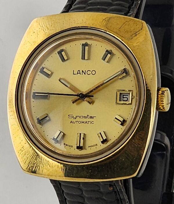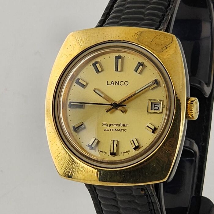 Dit horloge maakt gebruik van de bewegingsbasis komt van Omega. LANCO, Tissot en Omega zaten in de jaren zeventig onder dezelfde paraplu. LANCO Swiss Automatische datum. Koolstofvezel horloge groot maar toch licht 18k verguld LANCO herenpolshorloge in nette staat.