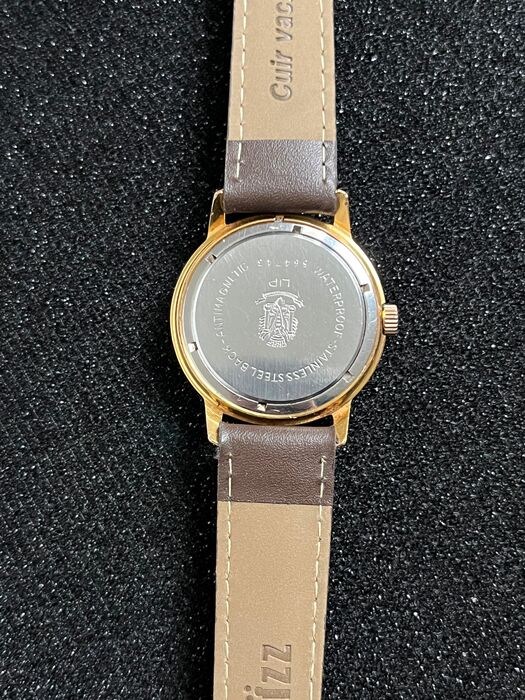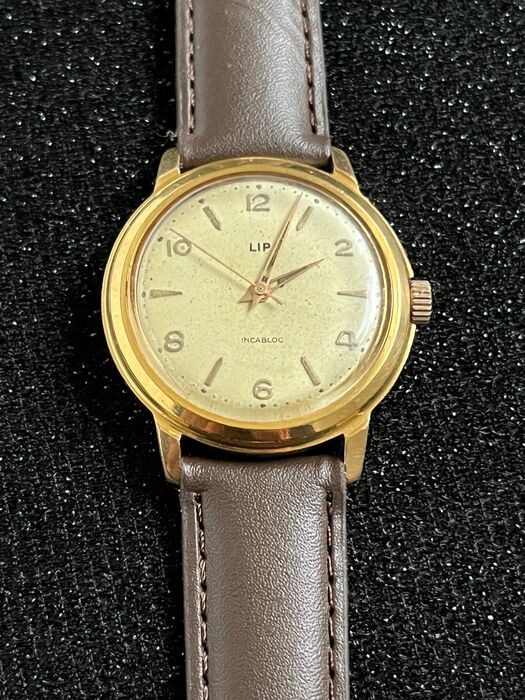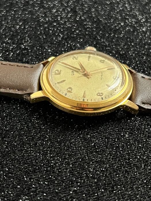 Lip vintage mechanisch in zeer goed werkende en esthetische staat, kast 34,5 goud opwindkast nieuwe leren band 22cm