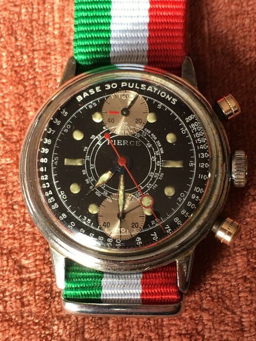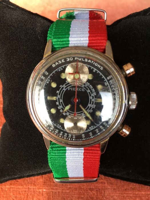 Hoewel ze buitengewoon verzamelbaar zijn, zijn Pierce-chronografen niet zo zeldzaam. Gesigneerde versie met het almachtige 134 pulsaties-kaliber dat tijdens de Tweede Wereldoorlog door Britse legermedici werd gebruikt. Het horloge bevat ook wat lijkt op de nylon nato-band.