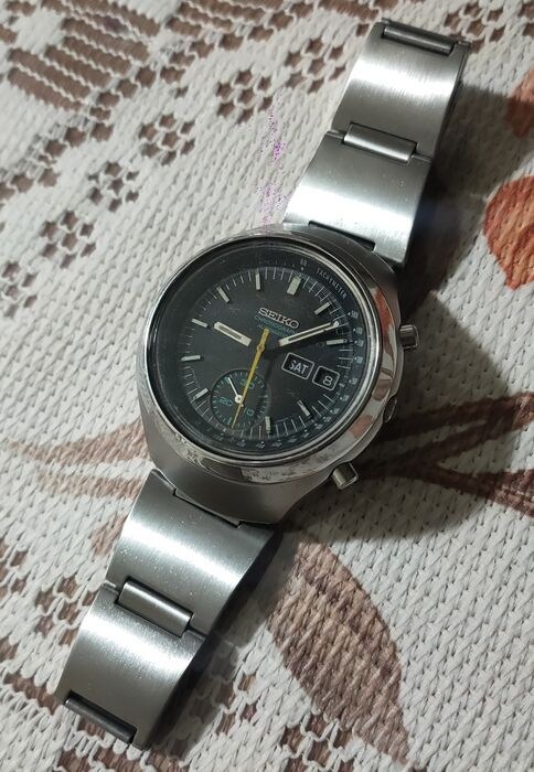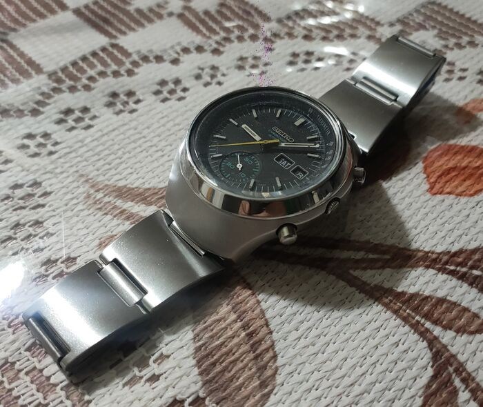 Referentie 782608 made in Japan Horloge uit augustus 1977 in perfect werkende staat en regelmatig onderhouden, perfecte tijd, datum en snelle reset van de datum, de chrono reset naar nul. Mooi zoals op de foto's, enkele krassen en deuken zijn tekenen van veroudering die het horloge verfraaien, kast van 40 mm die nooit is gepolijst, lengte armband 22 cm. Alleen kijken, geen doos, geen papieren. Uiterst zeldzaam en moeilijk te vinden horloge in uitstekende staat.