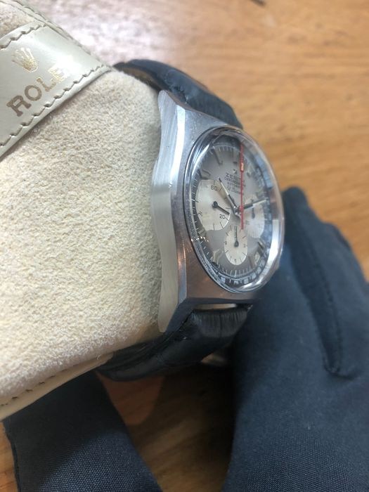 Schitterende wijzerplaat, beschadiging aan de inscriptie "tachymètre" en een prikje op 33 minuten.