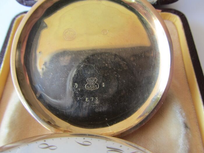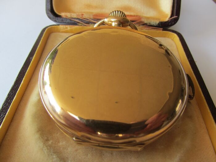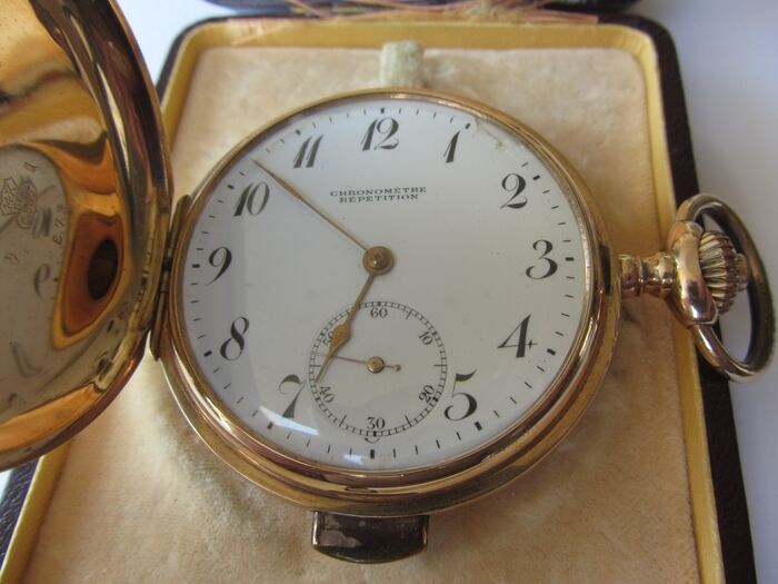 14 karaat gouden antiek zakhorloge met uur en kwartierslag. full hunter met dubbele gouden deksels.Te koop een 14 karaat gouden antiek zakhorloge met dubbele 14 karaat gouden deksels. full hunter.voorzijde te bedienen met mechanisme in de kroon, perfect functionerend en zonder deuken. in het deksel voorzijde staat een goudkeur 14k 0585 en links en rechts een kangoeroe, een kroon, en een keur in cirkel AR. in achterzijde dezelfde keuren en genummerd 108873. onder de decentrale seconde wijzer via druksysteem de repetitie af te roepen. en goed lopend. diameter zonder kroon 5,3 cm en met kroon 7,3 cmeen gewicht van 93 gram. binnendeksel metal. op deze deksel staat repetition A quarts Qualite superieure montre precicion en 6 cirkels. op de wijzerplaat staatchronometre repetition. lichte beschadeging bij de 1, gerepareerd en nauwelijks waarneembaar, zie foto. Het slaat eerst de uren dan pauze en dan met een helder geluid de kwartieren. komt in een antieke box G. Kreitz. word extra verzekerd, aangetekend en terdege ingepakt verzonden.